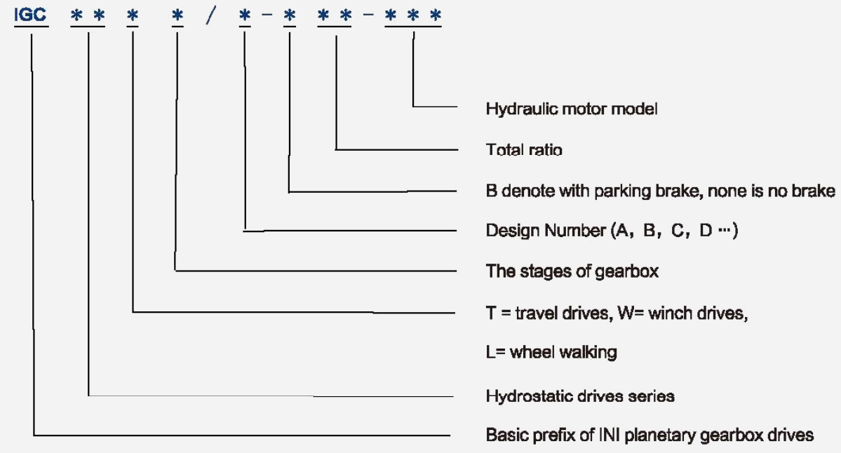| Seriekod | Utgångsmoment | Förhållande | Hydraulisk motor | Max Iopot hastighet | Bromsmoment | Hrake Trycka | Vikt | |