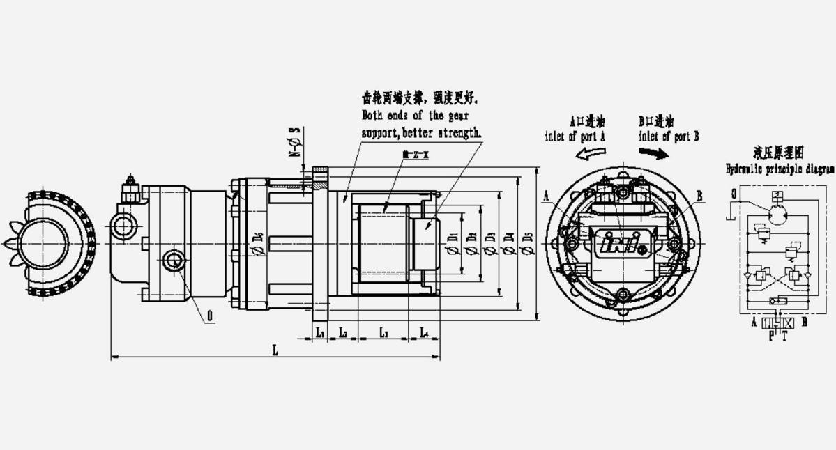 IYH-seriens hydrauliska svängdrev är egenutvecklade med oberoende intellektuella rättigheter. De består huvudsakligen av hydraulmotorer, hydrauliska flerskivbromsar, Ctype planetväxellådor och distributörer. hydrauliska motorer kan